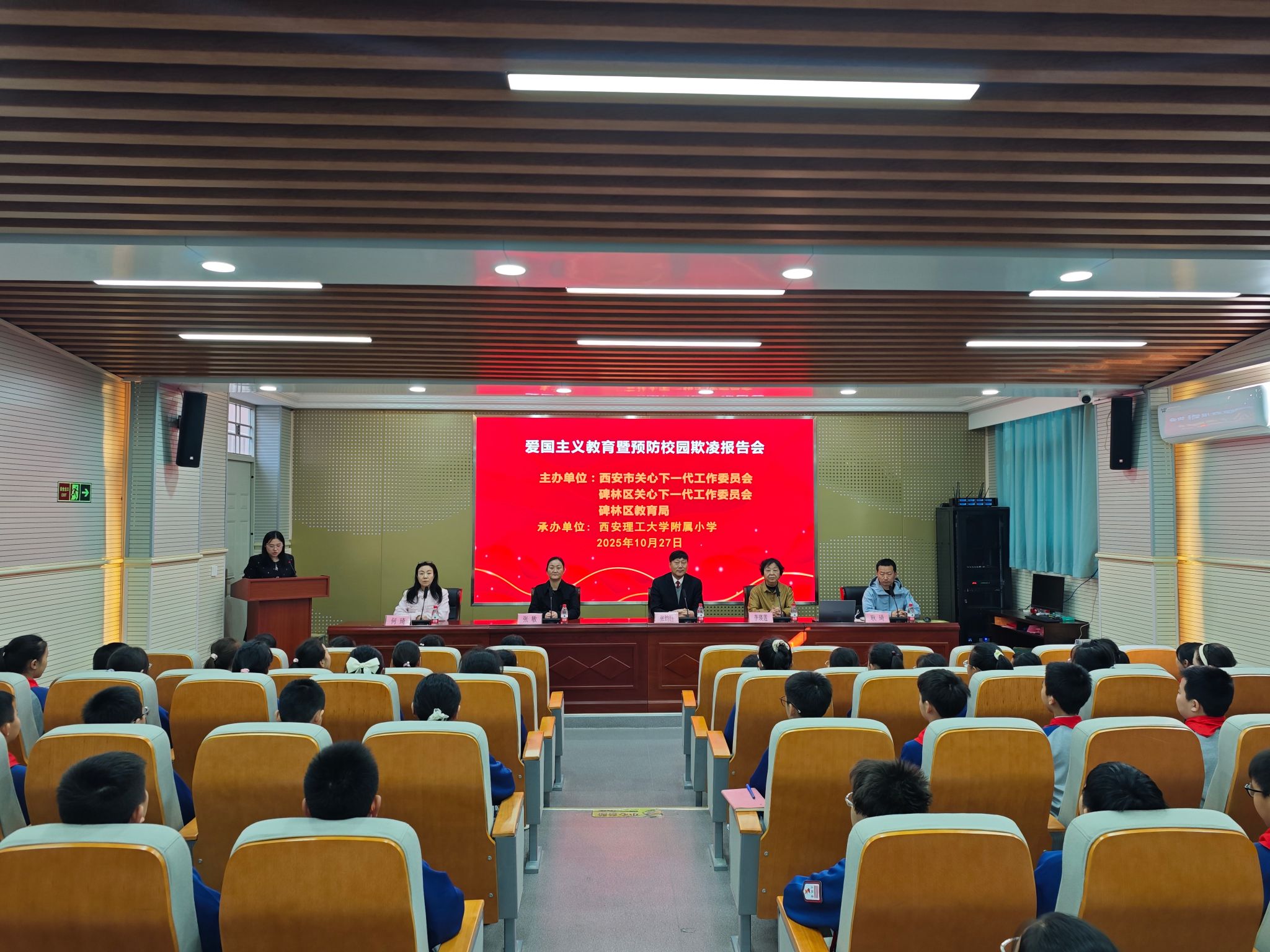 “起来,不愿做奴隶的人们……”嘹亮的国歌声响彻校园,激荡着少年学子的拳拳爱国心。2025年10月27日,由西安市关工委联合碑林区关工委、碑林区教体局主办的“爱国主义教育暨预防校园欺凌”法治报告会在西安理工大学附属小学举行,此活动为全体师生搭建起涵养爱国情怀、筑牢法治防线的学习平台。此次报告会特邀全国关心下一代工作先进集体成员、西安市关工委法治报告团宣讲员、中共西安市委党校教授张钧巨主讲。西安市碑林区关...