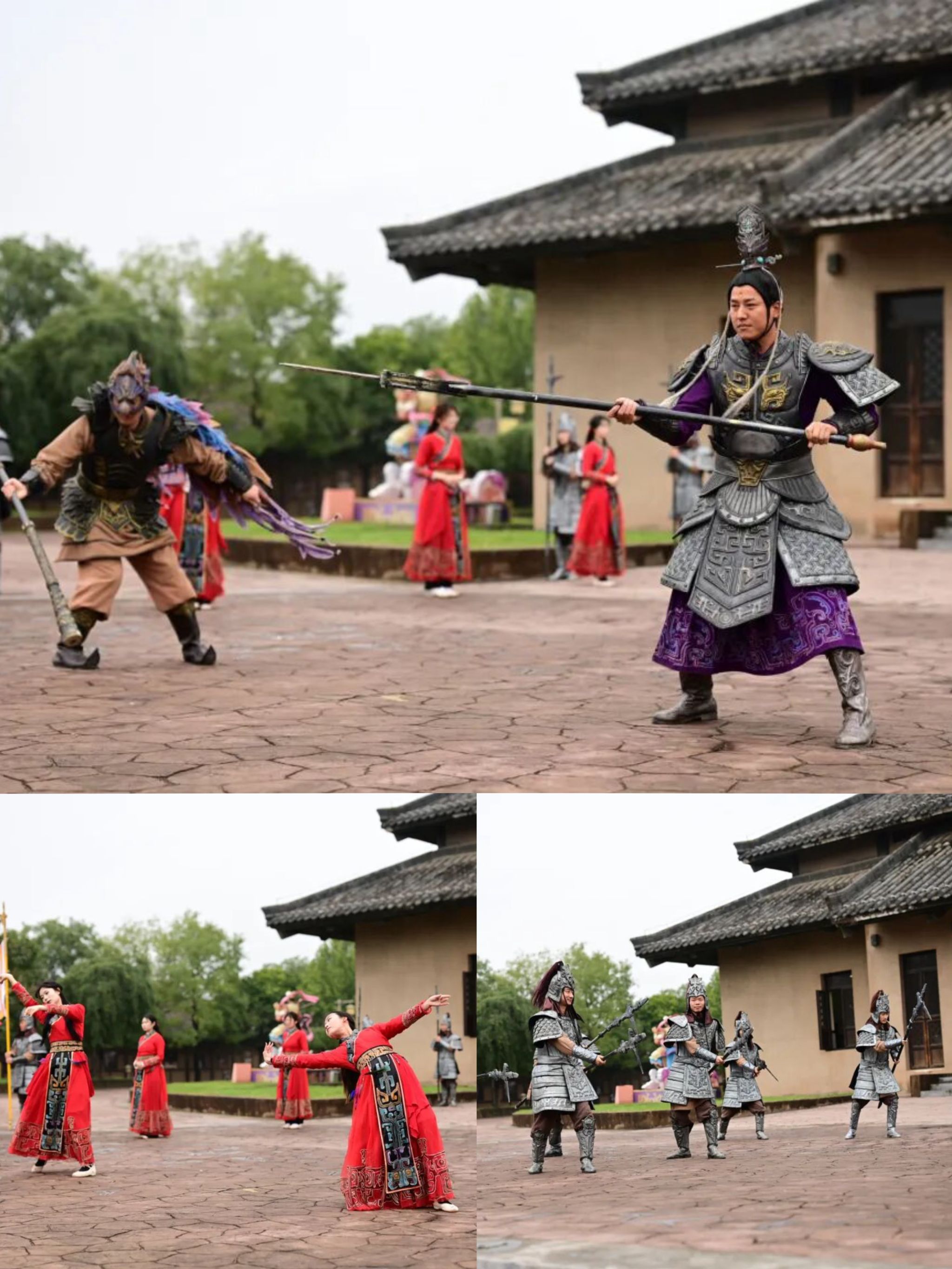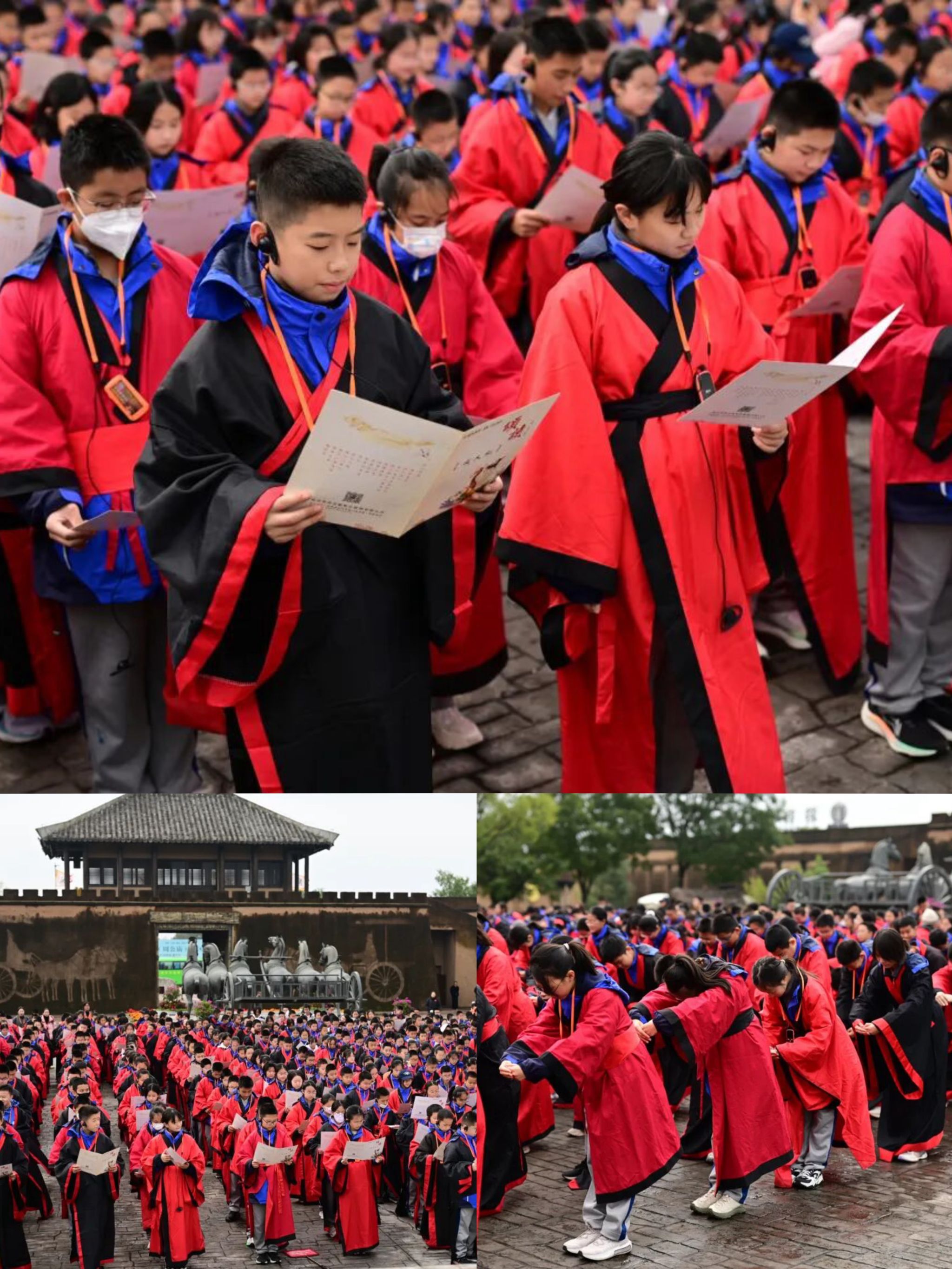 研学伊始,师生们怀着对周文化的向往有序登车,一路欢谈后抵达周原景区。一场庄重典雅的“南门迎宾礼”即刻拉开序幕,旌旗舒展,雅乐悠扬,身着周代服饰的礼官与仕女执礼相迎,尽展华夏礼仪之邦的雍容气度。同学们在沉浸式体验中初触周代礼乐魅力,正式开启文化寻踪。
