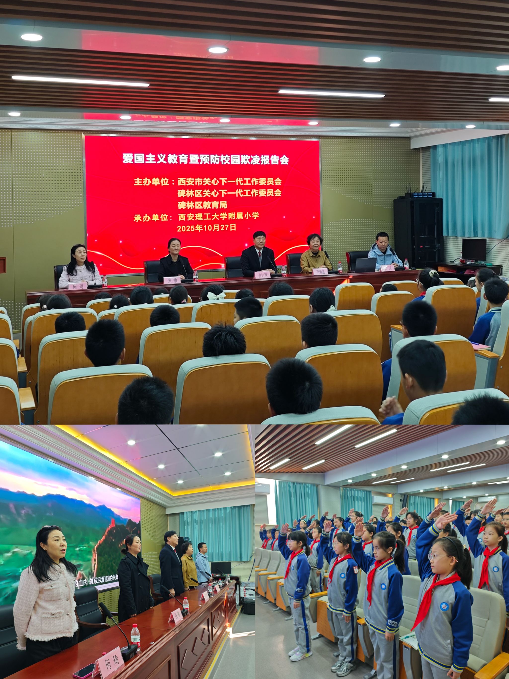 “起来,不愿做奴隶的人们……”嘹亮的国歌声响彻校园,激荡着少年学子的拳拳爱国心。2025年10月27日,由西安市关工委联合碑林区关工委、碑林区教体局主办的“爱国主义教育暨预防校园欺凌”法治报告会在西安理工大学附属小学举行,此活动为全体师生搭建起涵养爱国情怀、筑牢法治防线的学习平台。