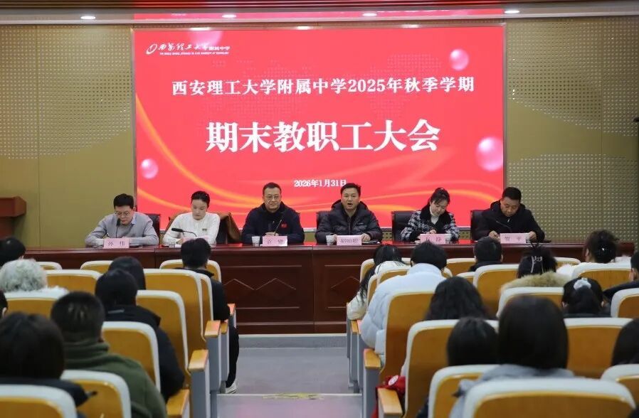 岁序更替,新程启幕。2026年1月31日,西安理工大学附属中学召开2025年秋季学期期末全体教职工大会,子弟学校党总支书记袁建,校长胡贻聪,副校长方静、曹红侠,校办主任孙伟及中学全体中层领导出席会议,会议由附属中学副校长贺平主持。