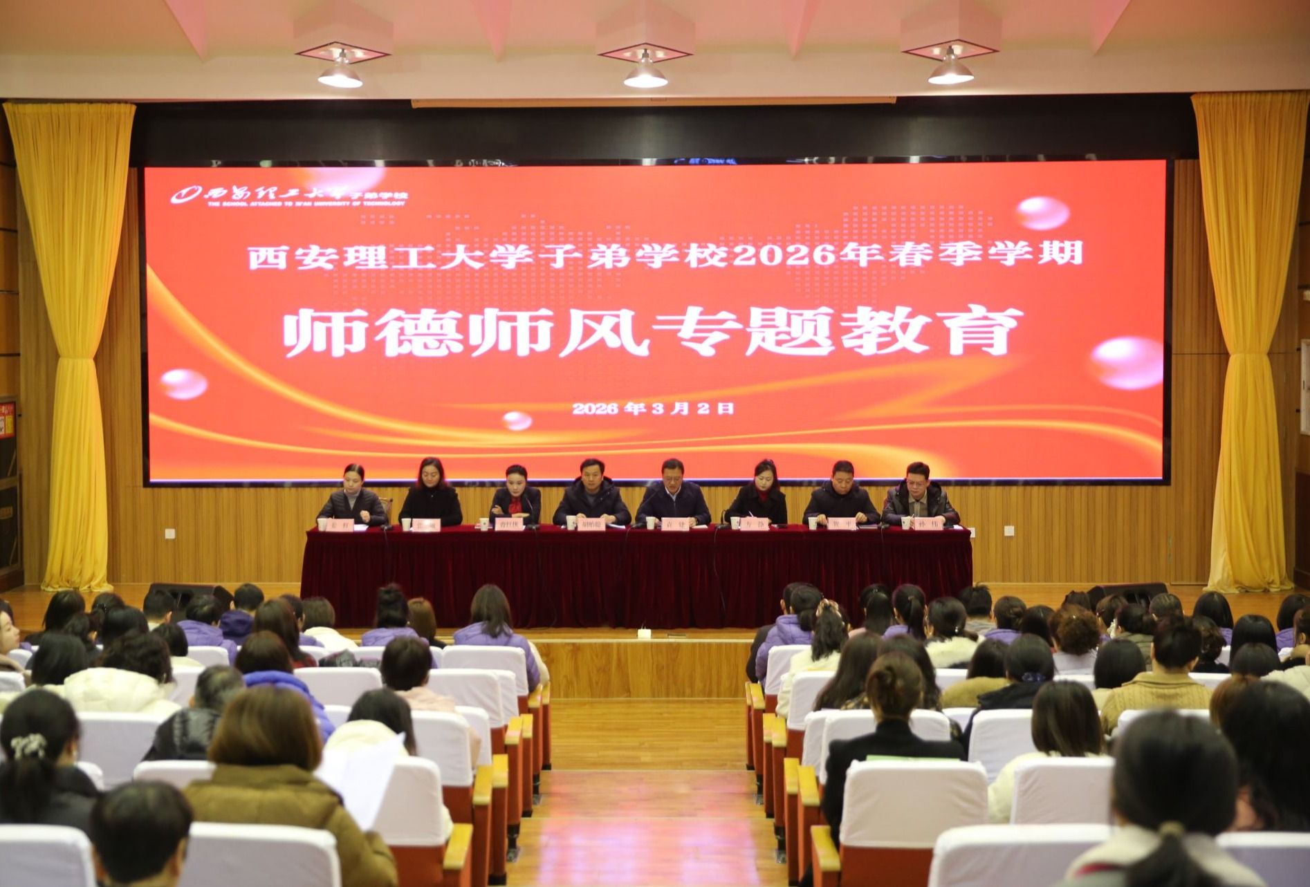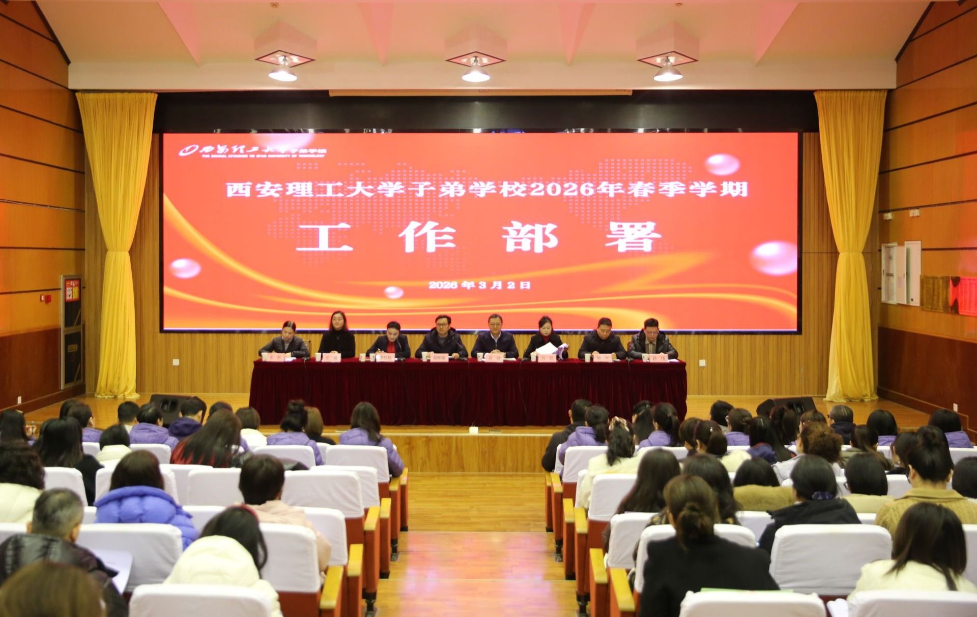 2026年3月2日,西安理工大学子弟学校召开2026年春季学期全体教职工大会。子弟学校党总支书记袁建、校长胡贻聪、副校长方静,附属中学副校长贺平、附属小学副校长张敏、幼儿园园长姜红,子弟学校办公室主任孙伟及中小幼各部门中层干部、全体教职工参加会议。会议由子弟学校副校长曹红侠主持。