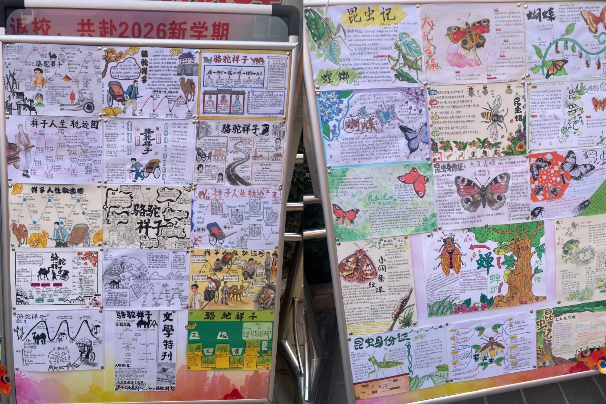 本次活动由学校政教处统筹设计,紧扣年级阅读特色设置实践任务。七年级聚焦《骆驼祥子》,以时间轴绘制人生轨迹图,图文并茂呈现祥子“三起三落”的关键经历与心态变迁;八年级围绕《昆虫记》制作创意昆虫身份证,生动展现昆虫外形、习性与独特本领,兼具知识性与趣味性。